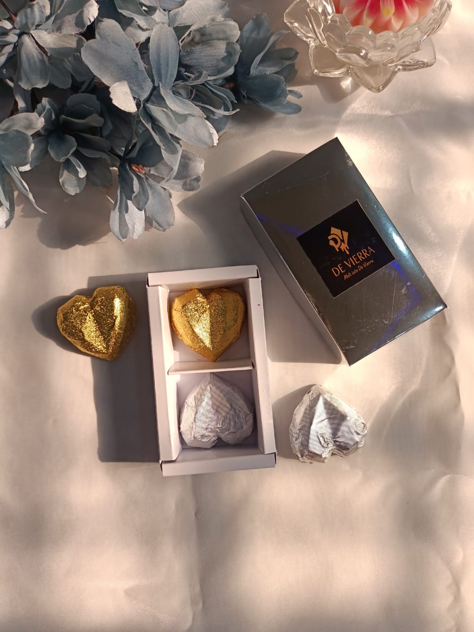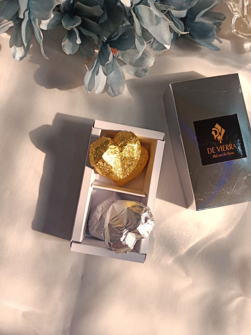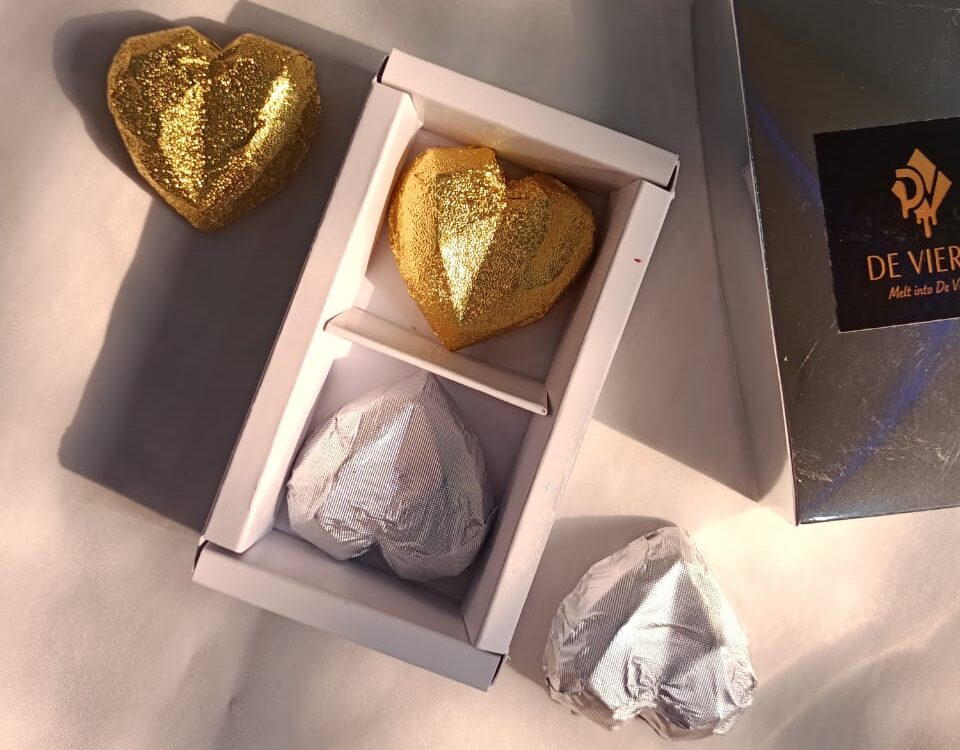 Heart-shaped chocolates wrapped in shimmering gold and silver β Wrapped Love is De Vierraβs celebration of romance, warmth, and timeless sweetness.