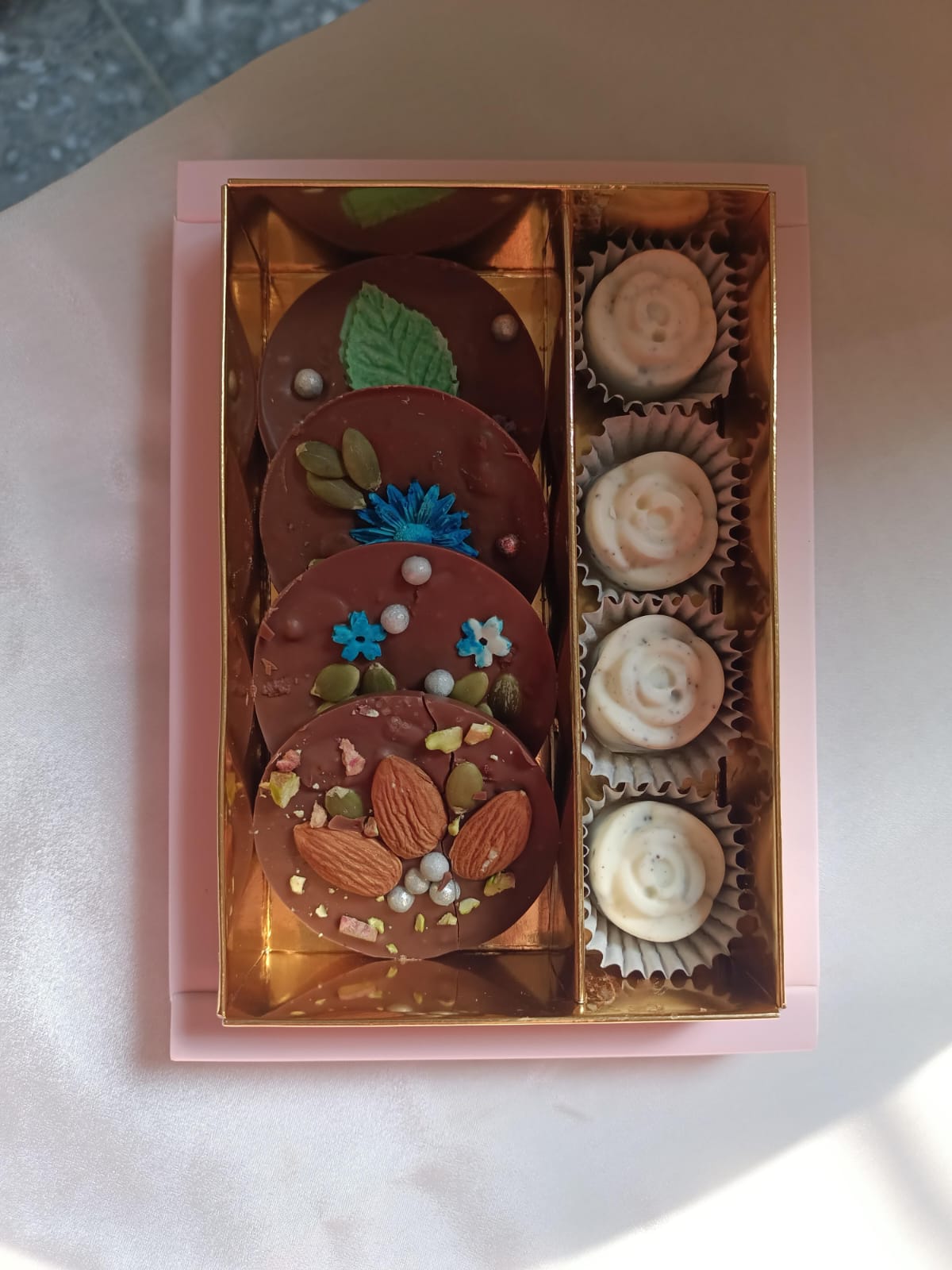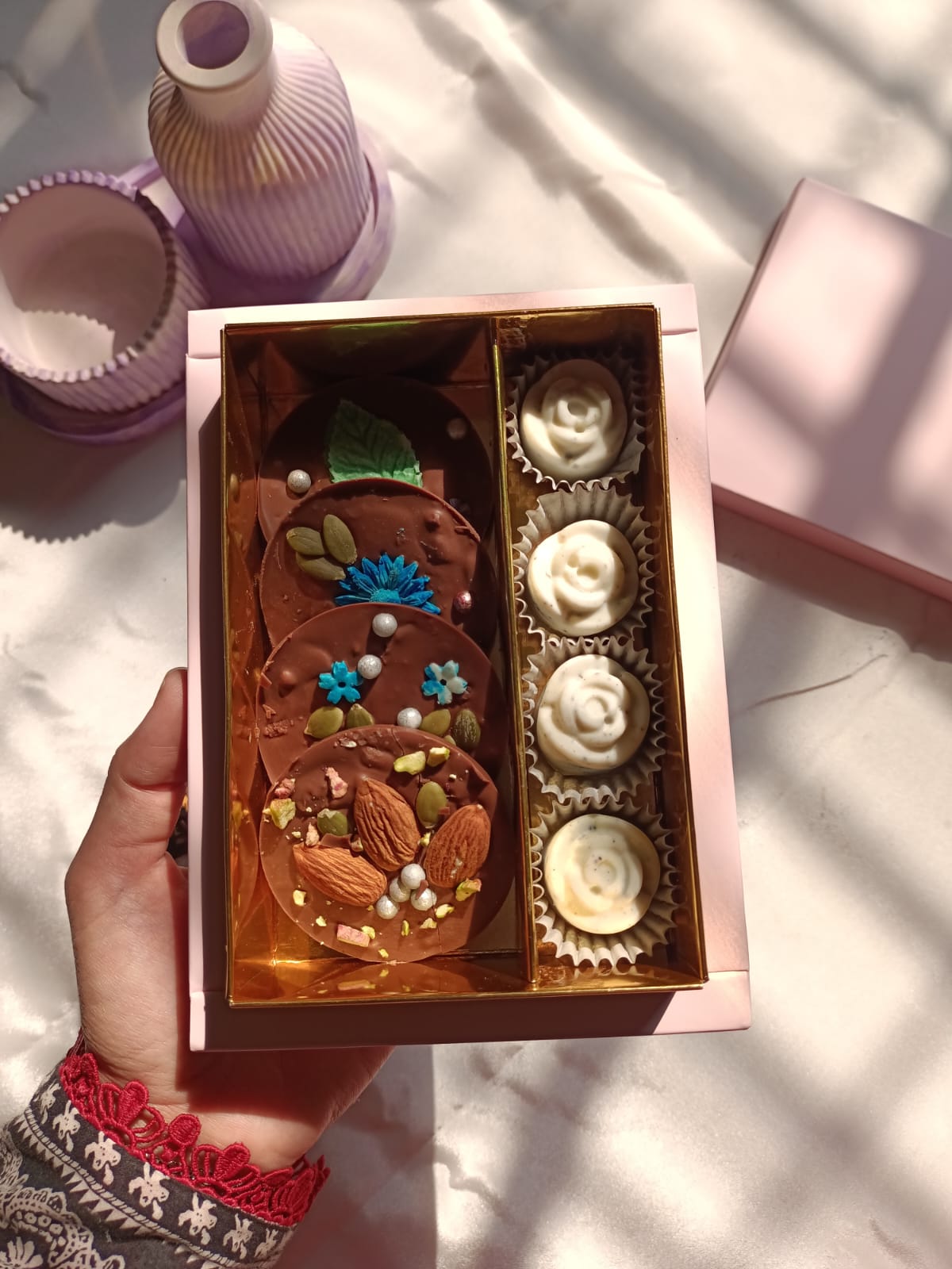 Enjoy the delicate, colorful charm of Bloom Bites β bite-sized artisanal chocolates infused with floral and fruity notes β alongside the creamy, cookie-rich delight of Frosted Oreo Chocolates, beautifully topped with a frosted finish.