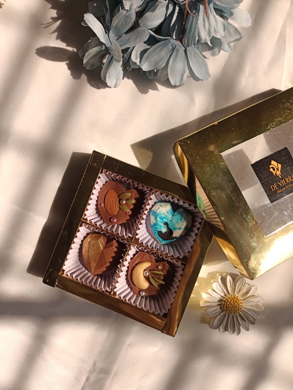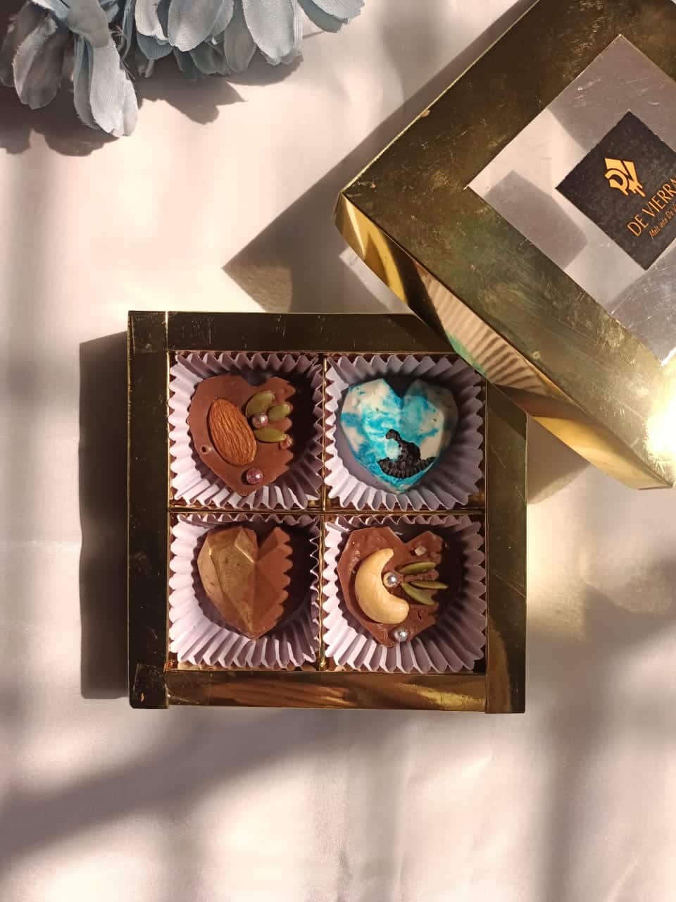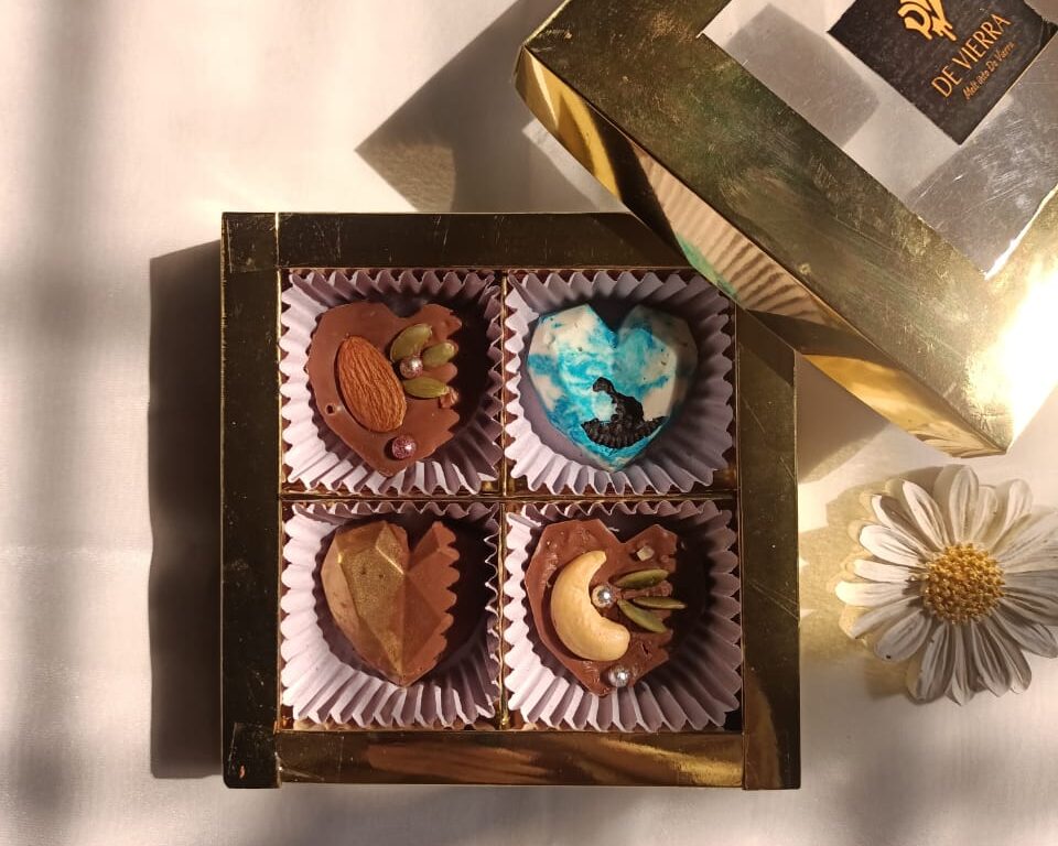Fall in love with De Vierra Crunchy Hearts — a charming collection of four beautifully molded heart-shaped chocolates. Each heart is filled with a smooth, creamy chocolate center and tiny crunchy bits that melt and crackle in perfect harmony.